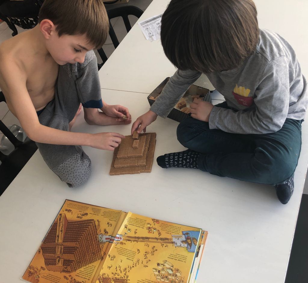 Construire une pyramide : Je me suis posée la question du matériel que nous pourrions utiliser. Et j’ai eu une idée : pourquoi ne pas utiliser des carrés de sucre ? Du sucre roux serait encore mieux. Il s’agit en effet d’une activité qui ne coute rien. Parce que le sucre peut être utilisé après. Pour commencer, nous avons regarder un épisode de « c’est pas sorcier » sur les pyramides. Ensuite nous avons lu un livre sur le sujet (le premier dans ma liste de lecture). Et enfin, libre court à leur imagination de futur architecte.