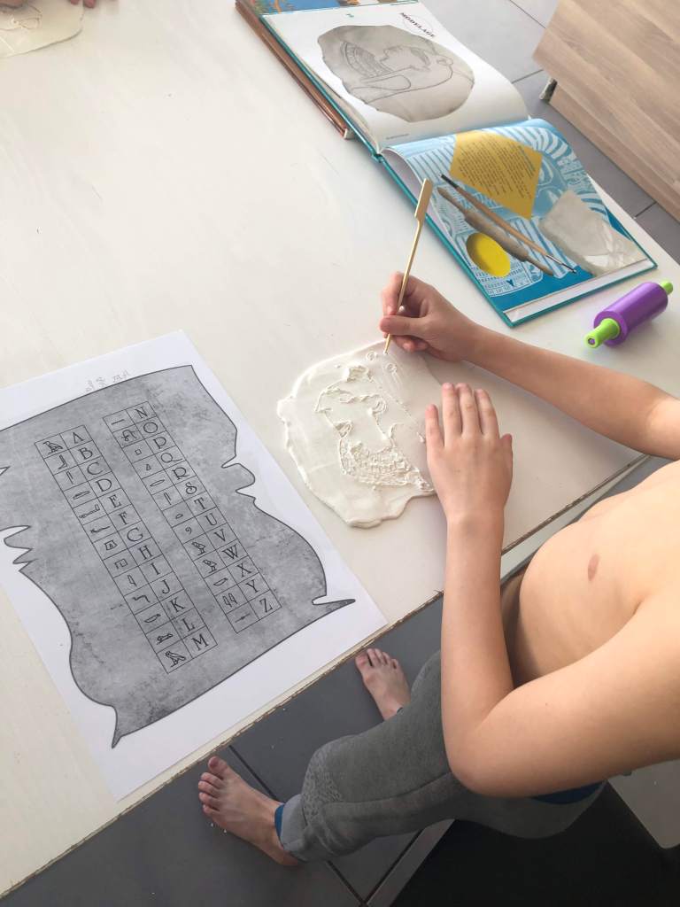 Les hiéroglyphes : Comme avec la momie, vous pouvez utiliser de la pâte durcissante, de la pâte à modeler ou de la pâte à sel. Après avoir étudier les hiéroglyphes et l’écriture des égyptiens. Etaler la pate durcissante pour former une stèle. Pas trop fine pour éviter de la trouer. Avec un petit bâton en bois, votre enfant pourra faire comme les égyptiens et s’inspirer des hiéroglyphes. S’il n’a pas d’inspiration, donner lui un modèle. Pour finir il pourra signer son œuvre avec son prénom en hiéroglyphe bien sûr ! Montrer lui ce tableau et encourager le par ce qu’ils ne sont pas facile à faire…