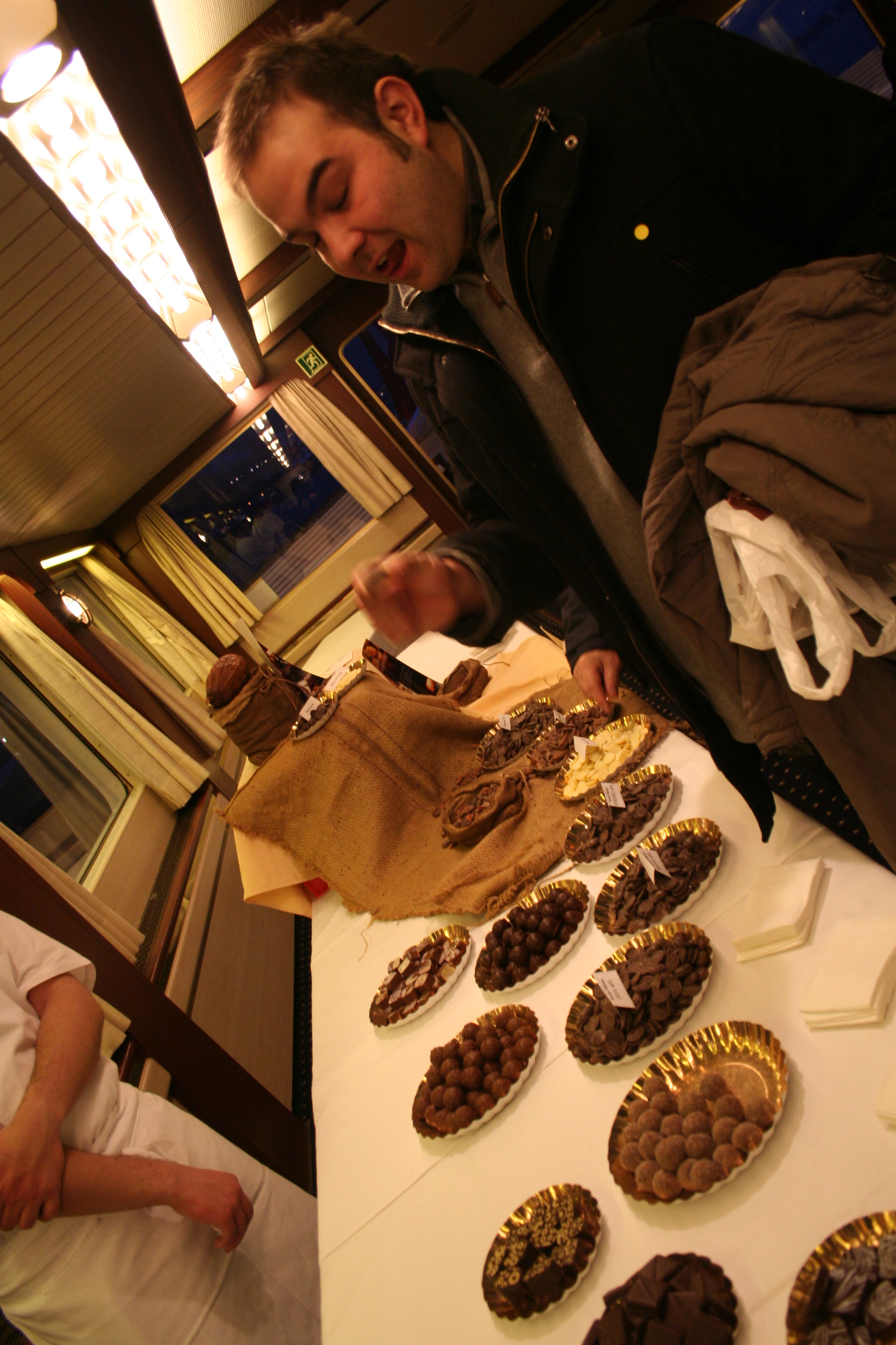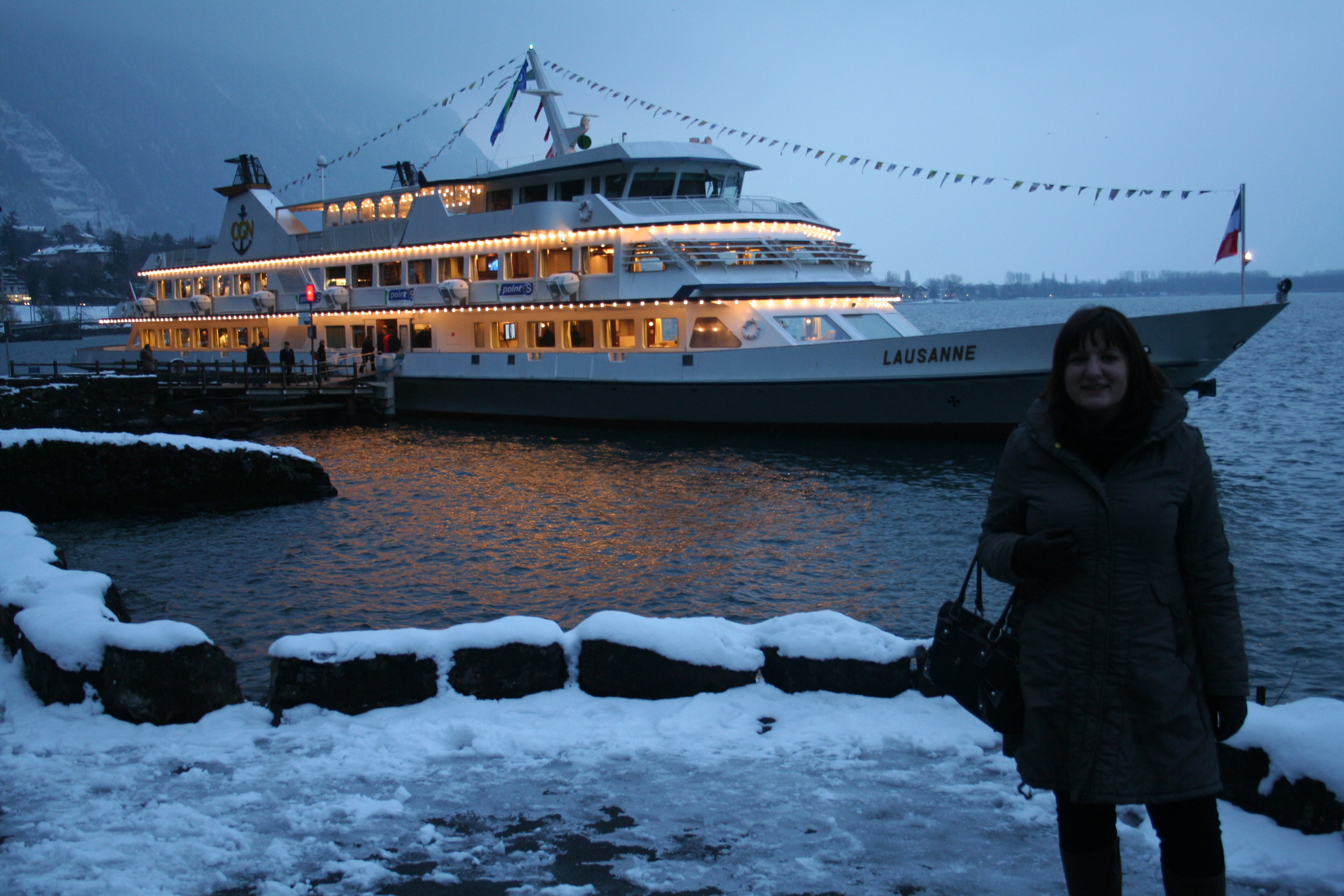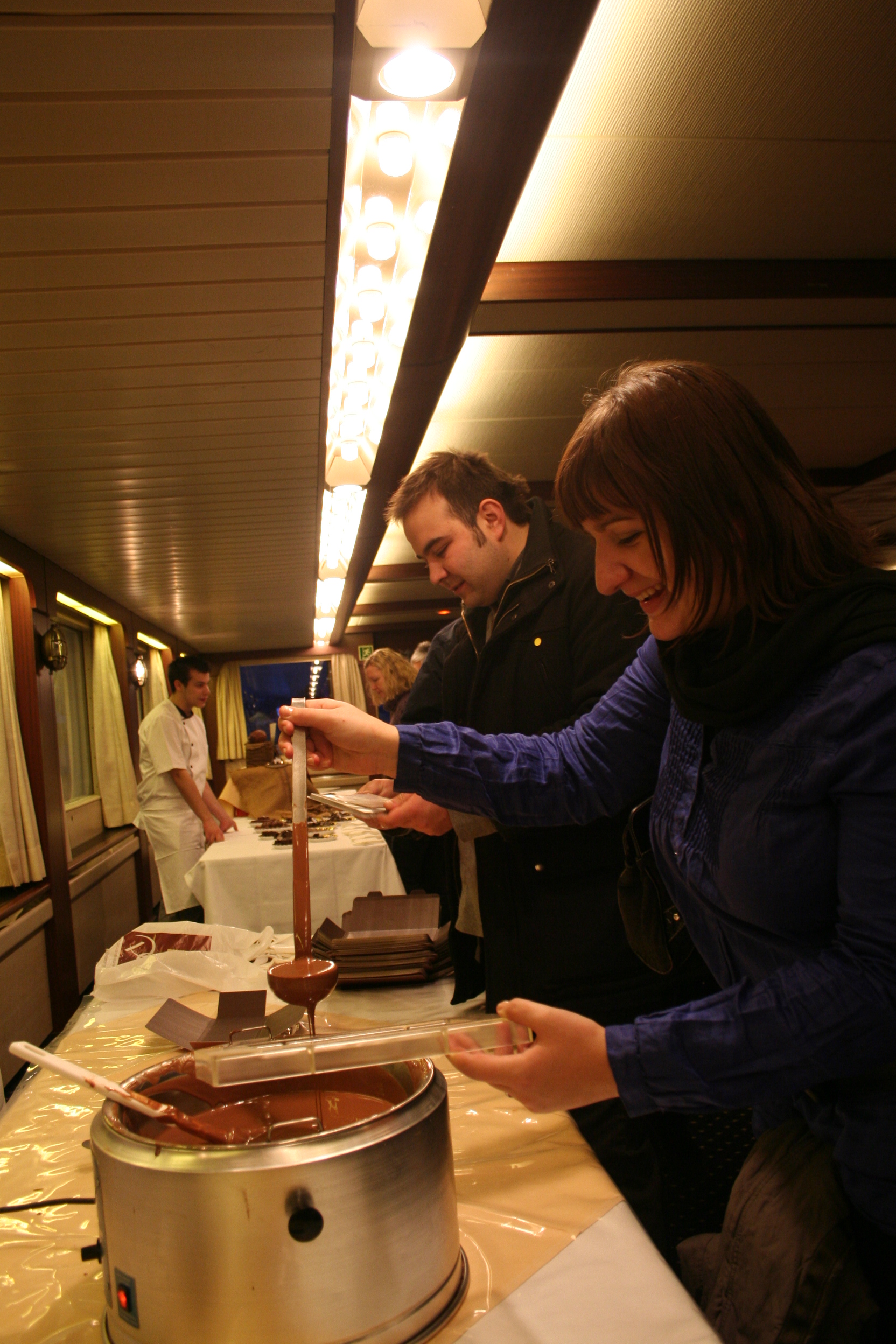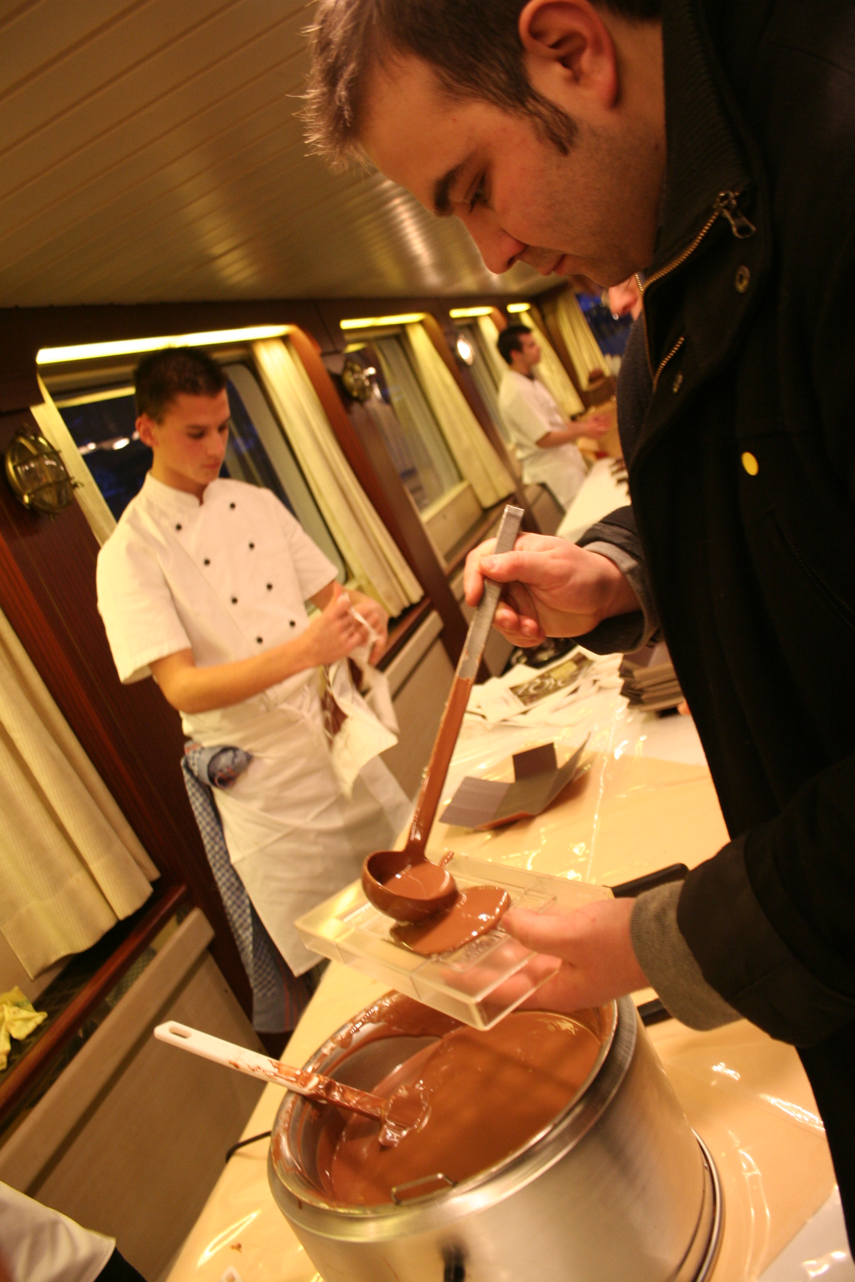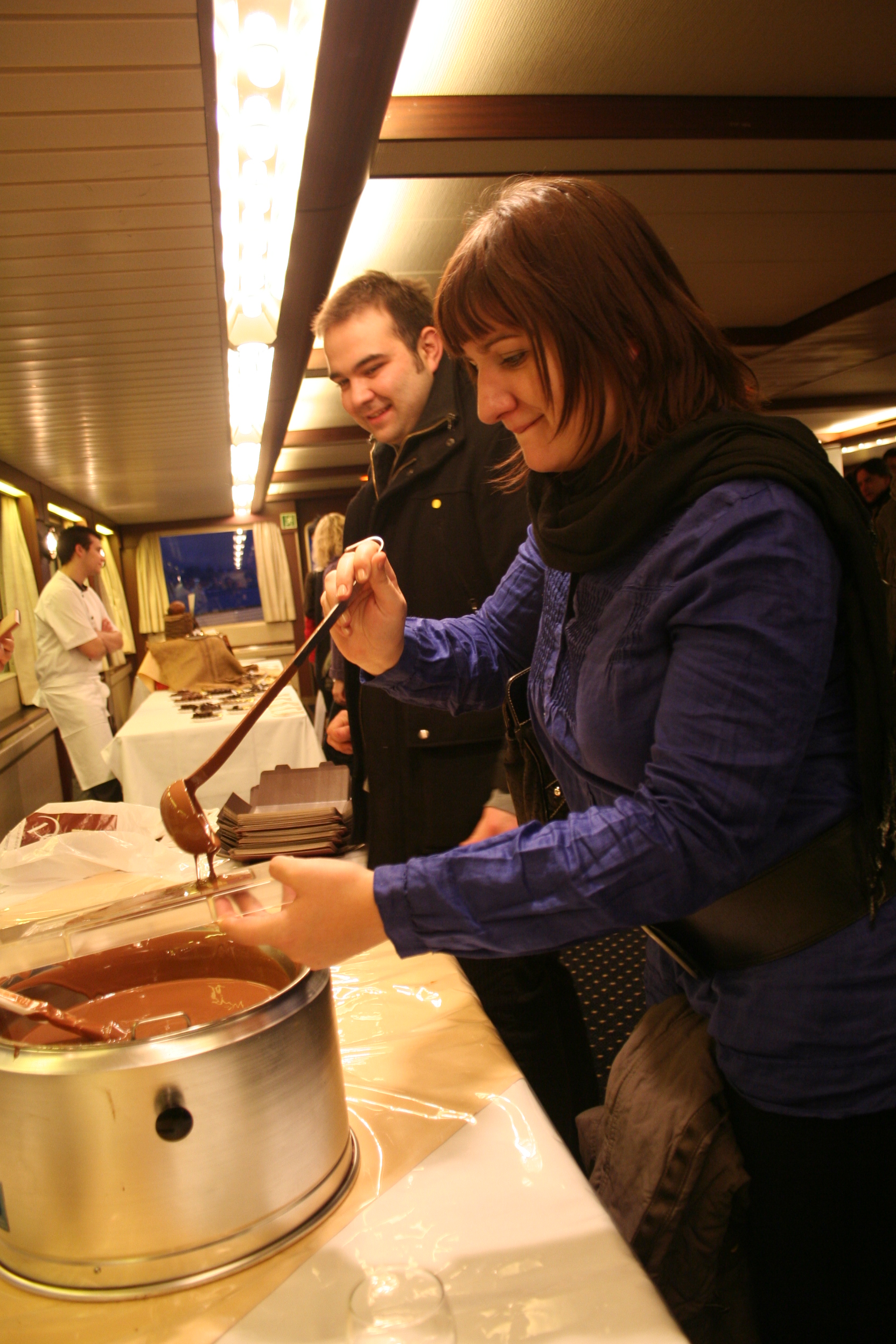 Encore une belle activité nous attend. Nous la voyons arriver depuis les hauteurs du château. Un bateau nous emmène pour une ballade sur le lac. Les lumières de la ville s’allument et le feu d’artifices prévu pour l’occasion nous offrent un joli spectacle. Et comme le chocolat représente aussi le chocolat, nous avons pu réaliser notre propre plaque de chocolat.