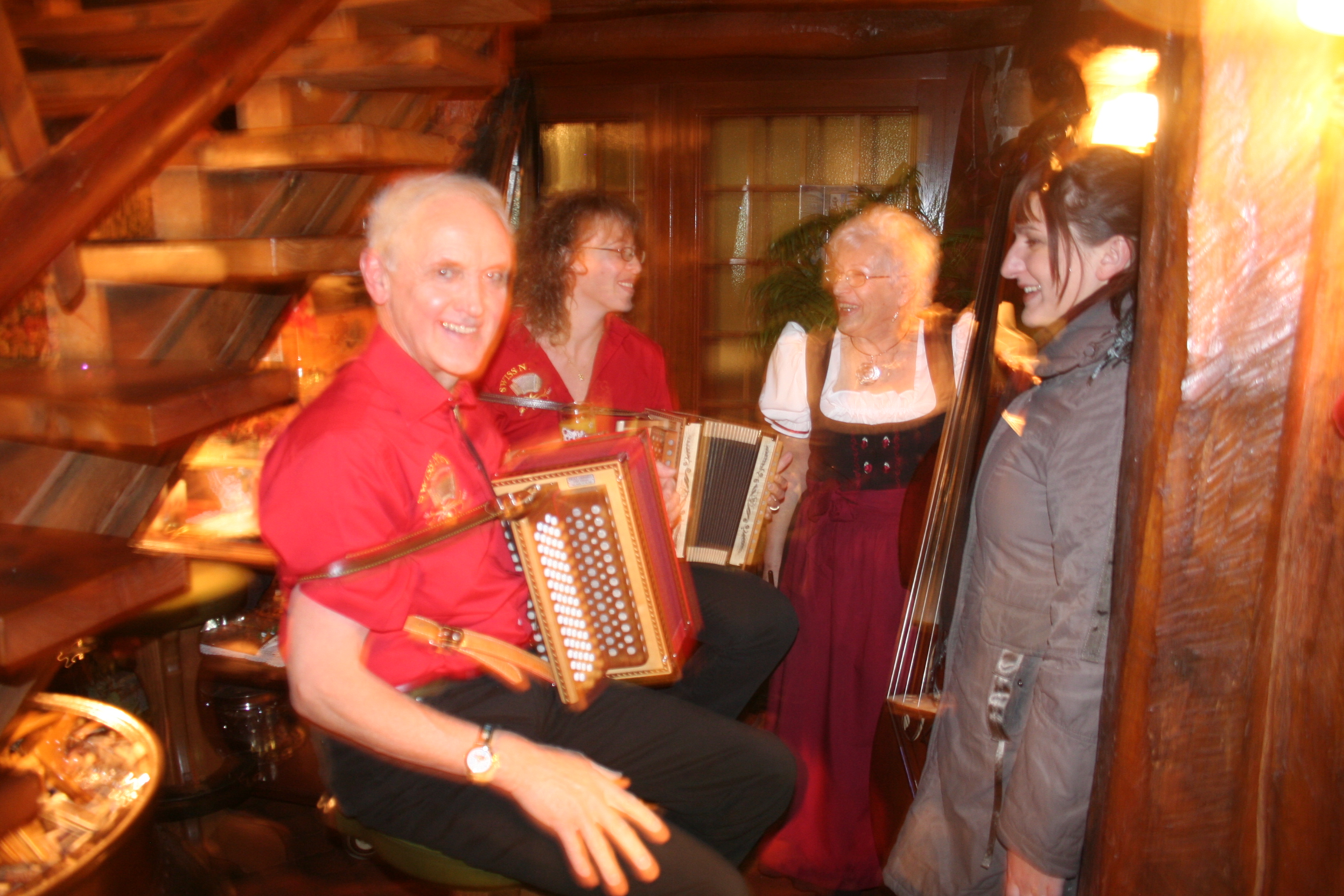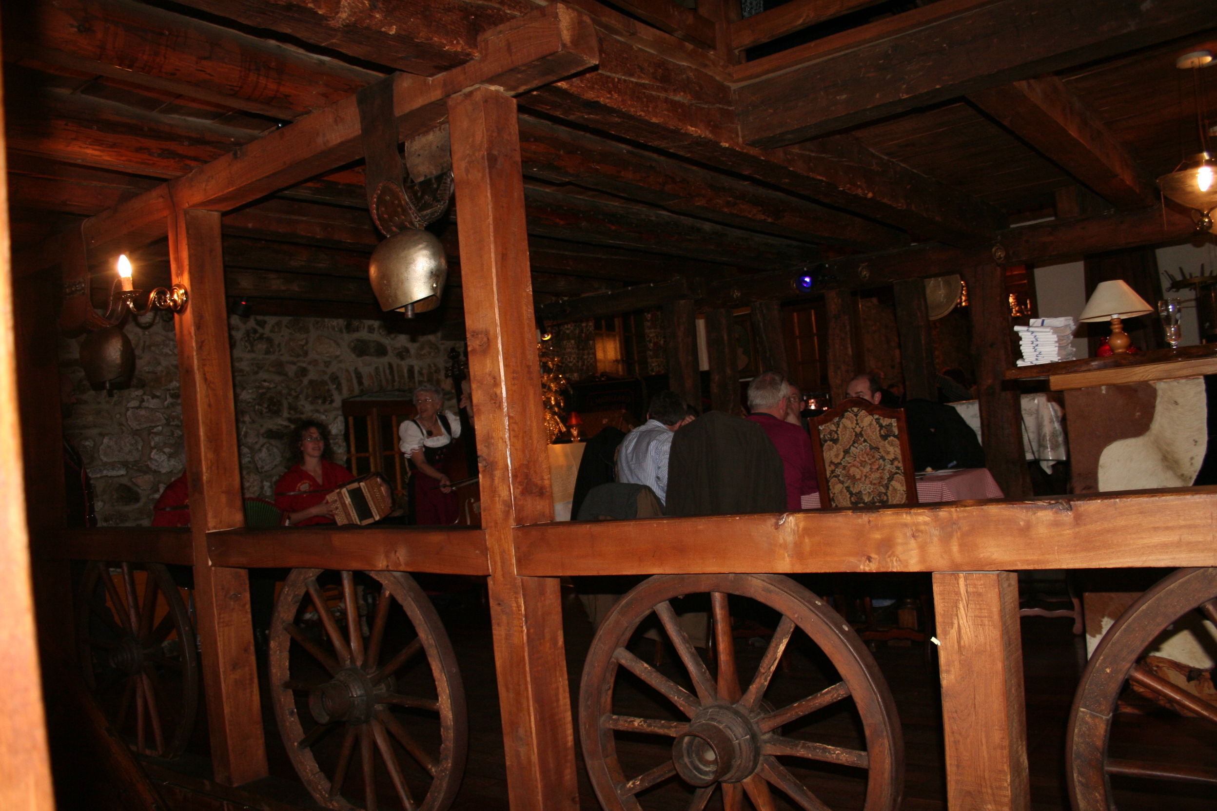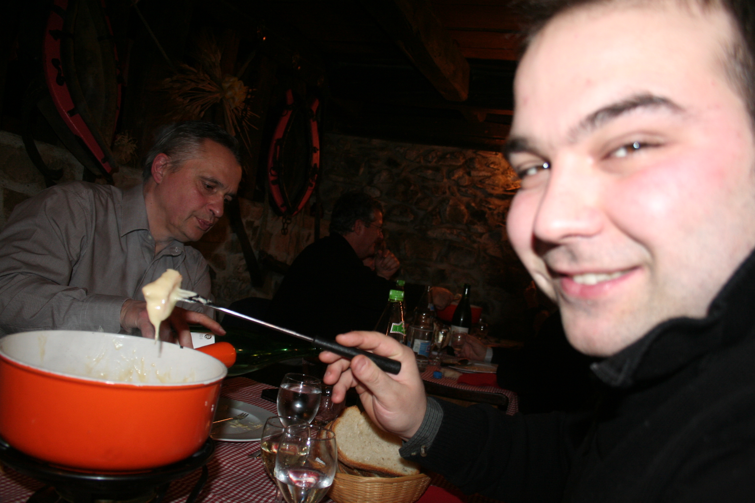 C’est dans ce restaurant typiquement suisse que nous avons mangé une spécialité du coin : la fondue savoyarde. Deux hommes habillés de costumes traditionnels nous accueillent avec des cors des Alpes. Tout le personnel est habillé de manière traditionnelle. L’ambiance est très festive ! Un orchestre met l’ambiance et nous avons même pu assister à une tradition musicale suisse : le talerschwingen consiste à faire tourner une pièce de cinq francs dans un bol. La pièce de monnaie roule dans un bol de faïence que le joueur fait tourner lentement. Trois diamètres de bols sont utilisés pour varier la hauteur du son.