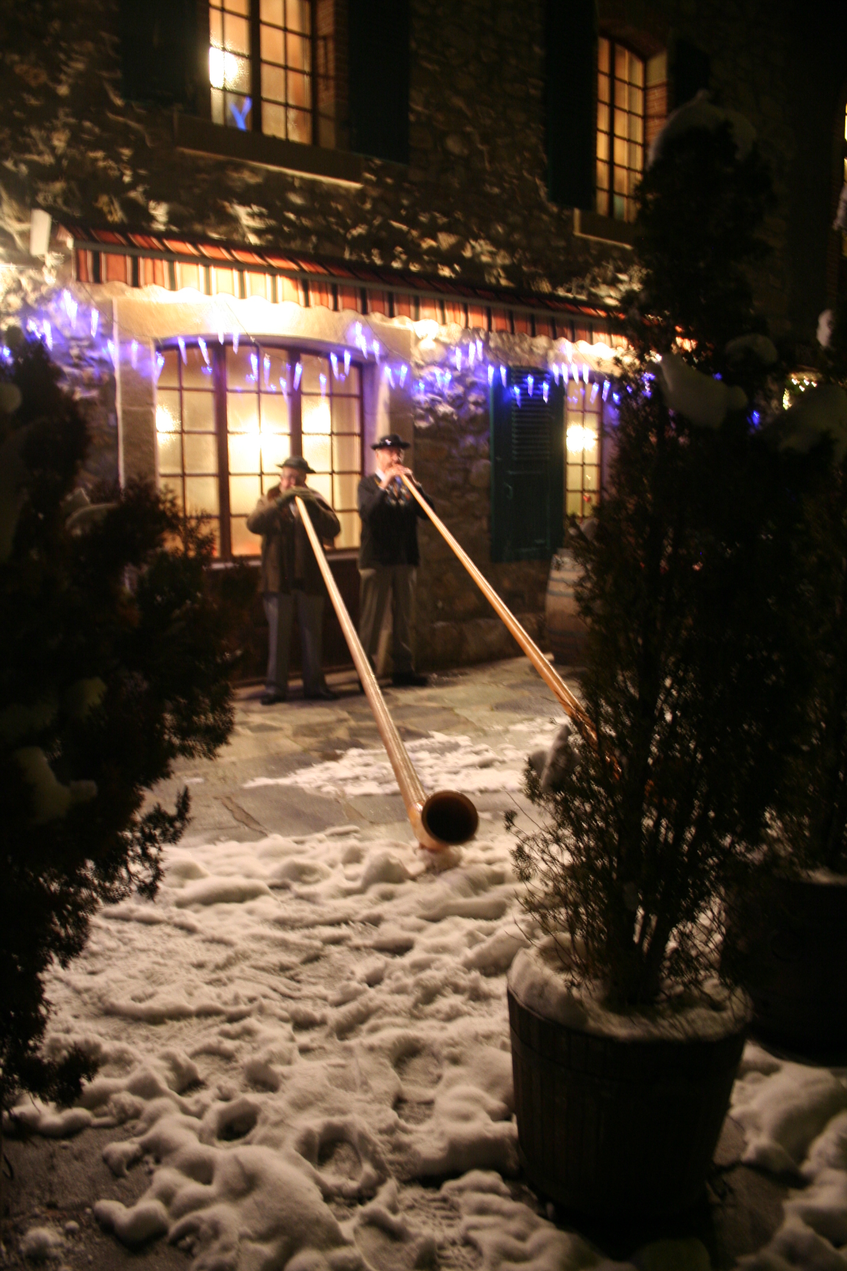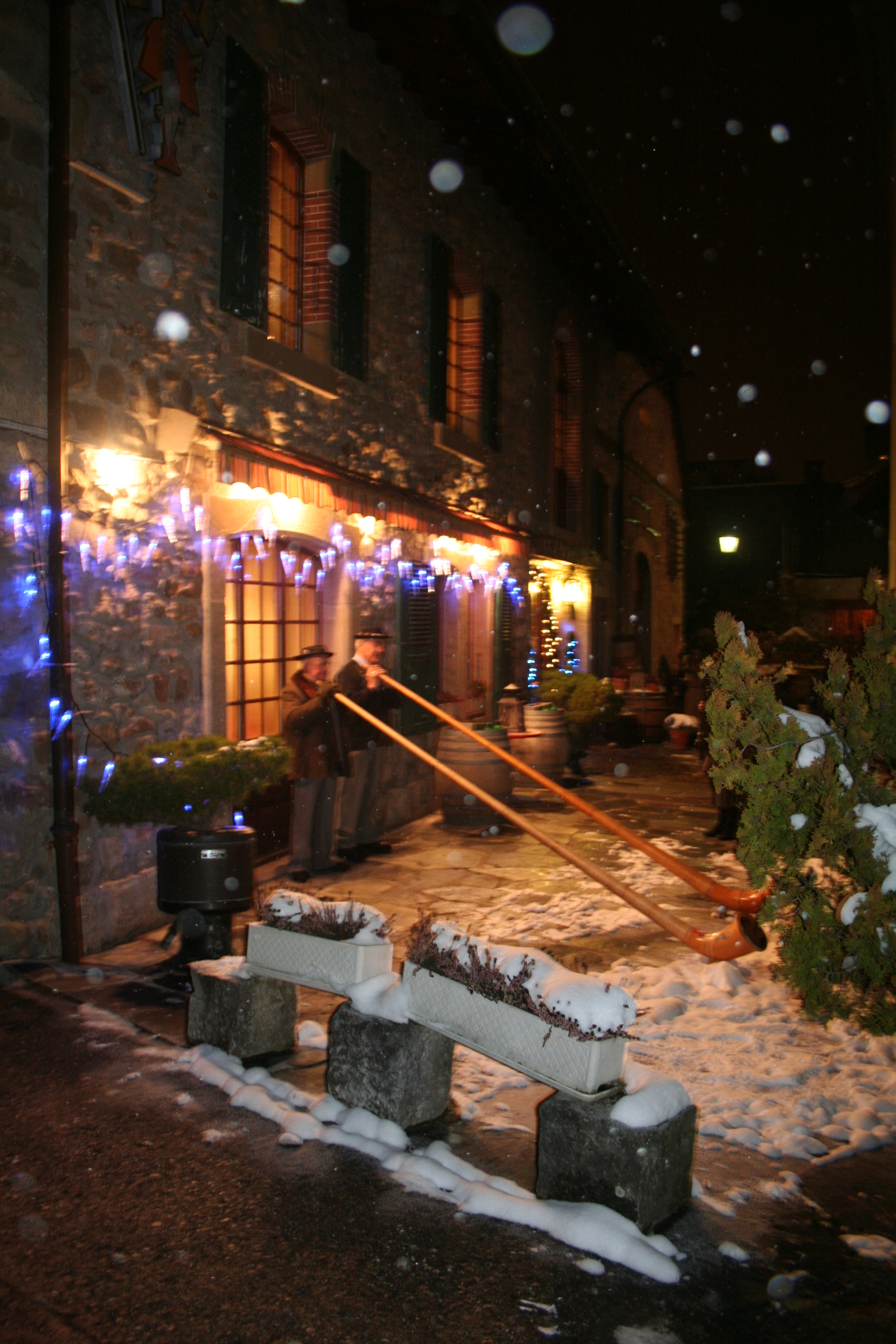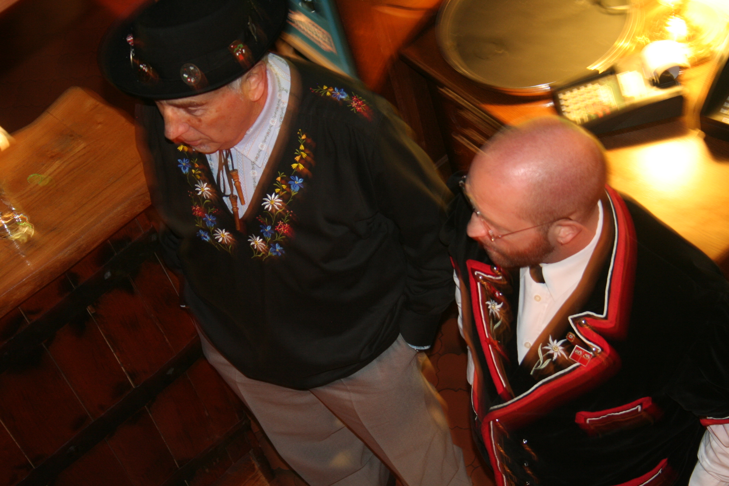 C’est dans ce restaurant typiquement suisse que nous avons mangé une spécialité du coin : la fondue savoyarde. Deux hommes habillés de costumes traditionnels nous accueillent avec des cors des Alpes. Tout le personnel est habillé de manière traditionnelle. L’ambiance est très festive ! Un orchestre met l’ambiance et nous avons même pu assister à une tradition musicale suisse : le talerschwingen consiste à faire tourner une pièce de cinq francs dans un bol. La pièce de monnaie roule dans un bol de faïence que le joueur fait tourner lentement. Trois diamètres de bols sont utilisés pour varier la hauteur du son.