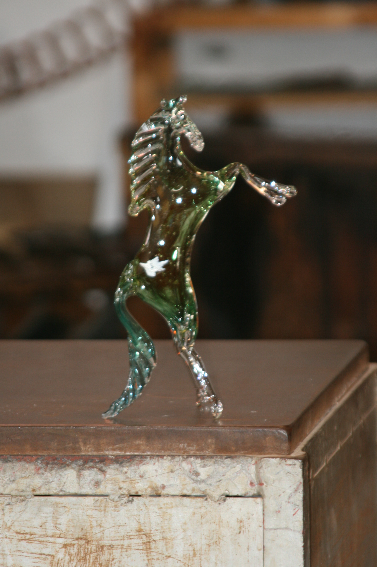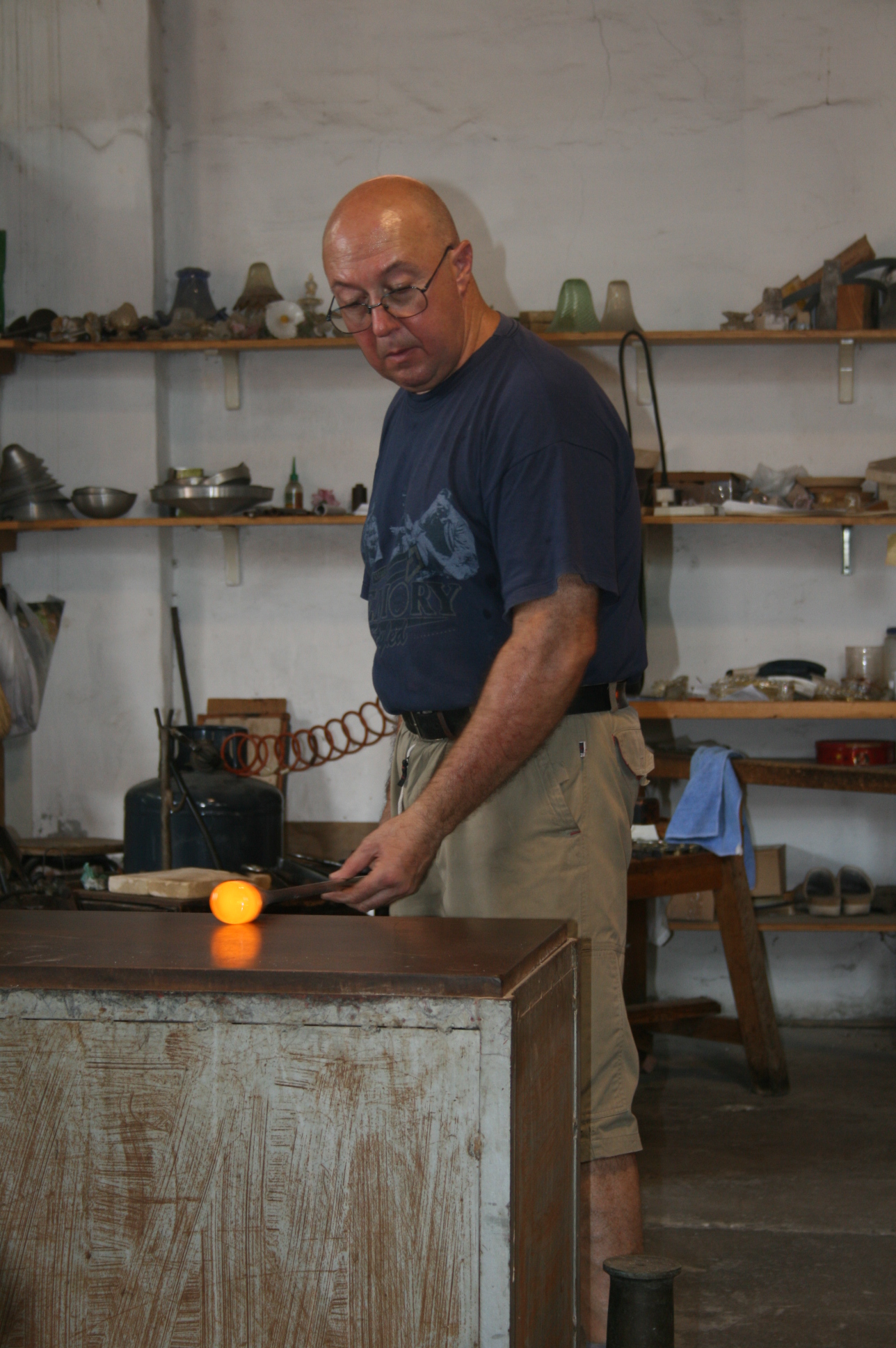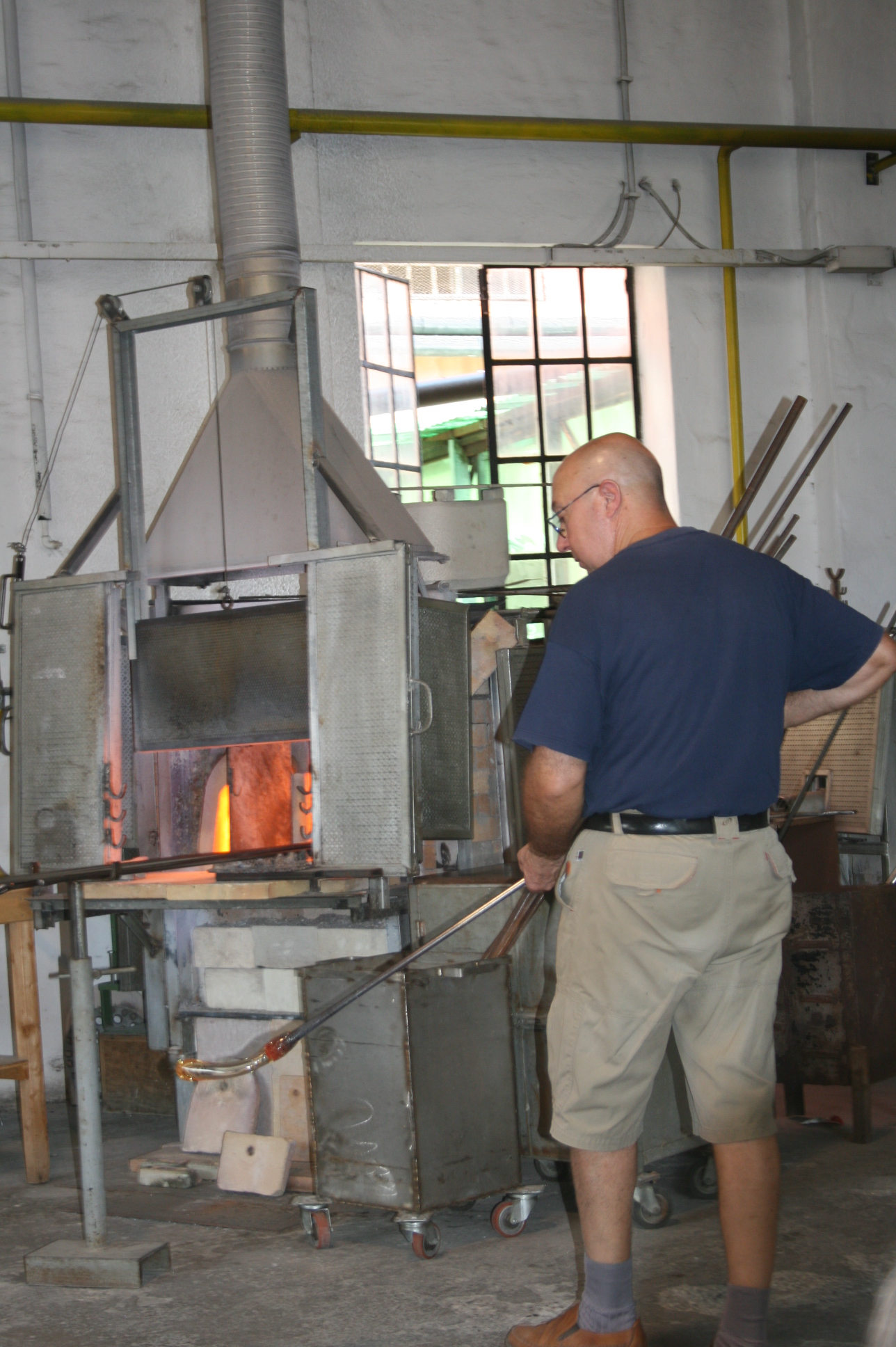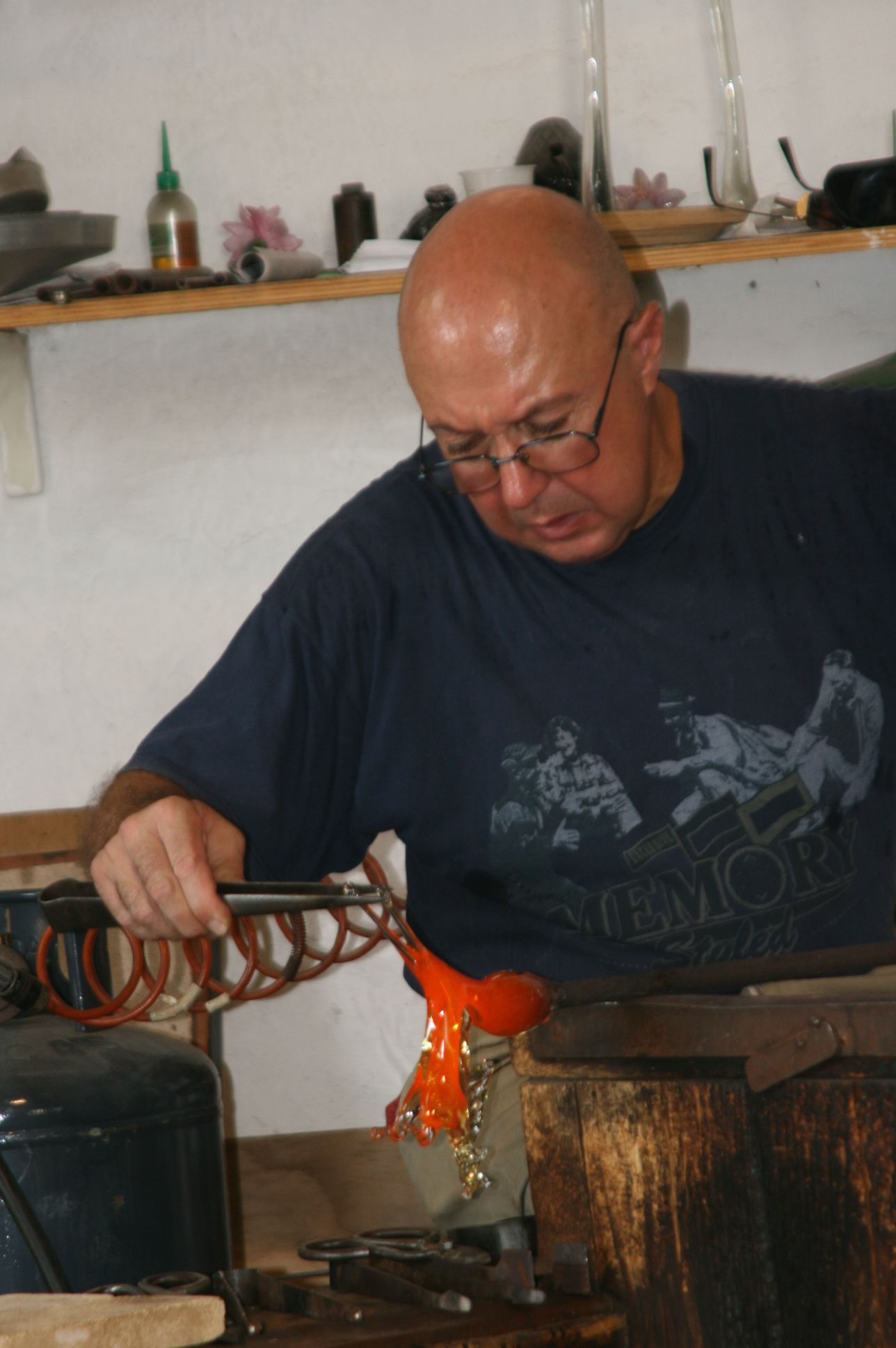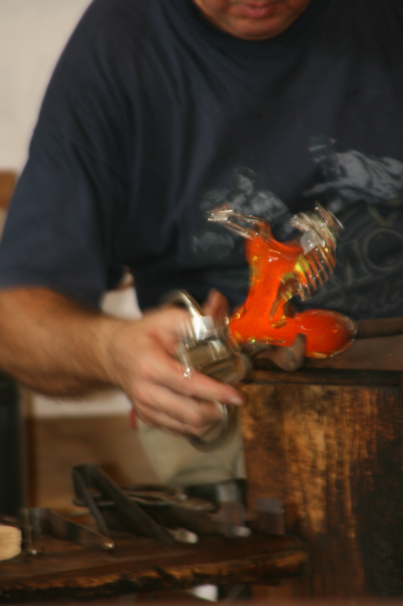 Nous avons assisté à la représentation d’un verrier. Pendant que le verre est encore rouge, il le manipule très vite. En deux trois tours de main, un cheval apparaît.