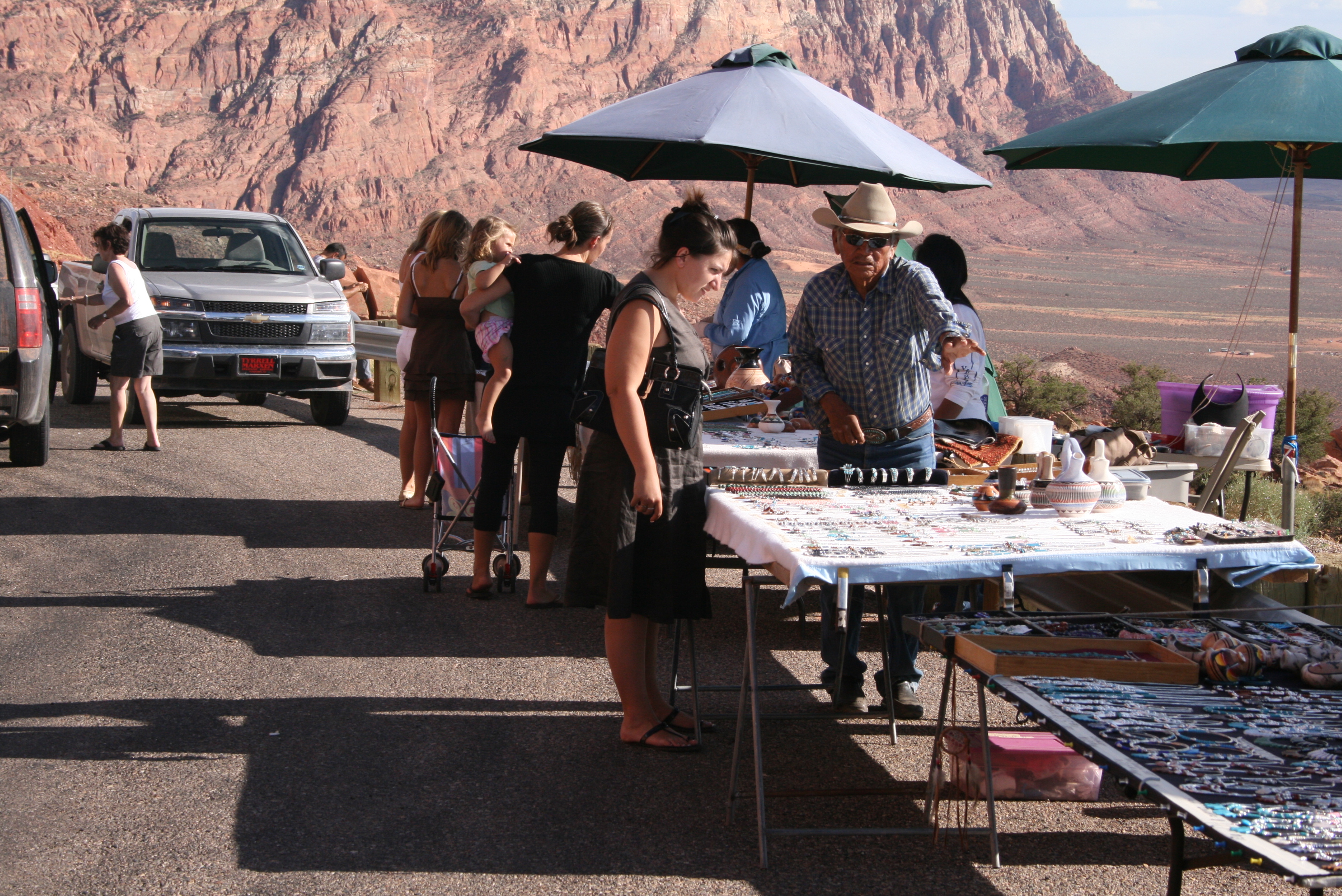 La route est toujours aussi belle ! Nous nous arrêtons dans ce désert de roches sur un marché improvisé au bord de la route. Des indiens vendent leurs créations (bijoux, sculptures, pierres…). Ici les tribus indiennes sont très pauvres et souvent isolées. Ce petit marché est l’occasion d’entrer en contact avec eux et de voir et acheter des objets locaux.