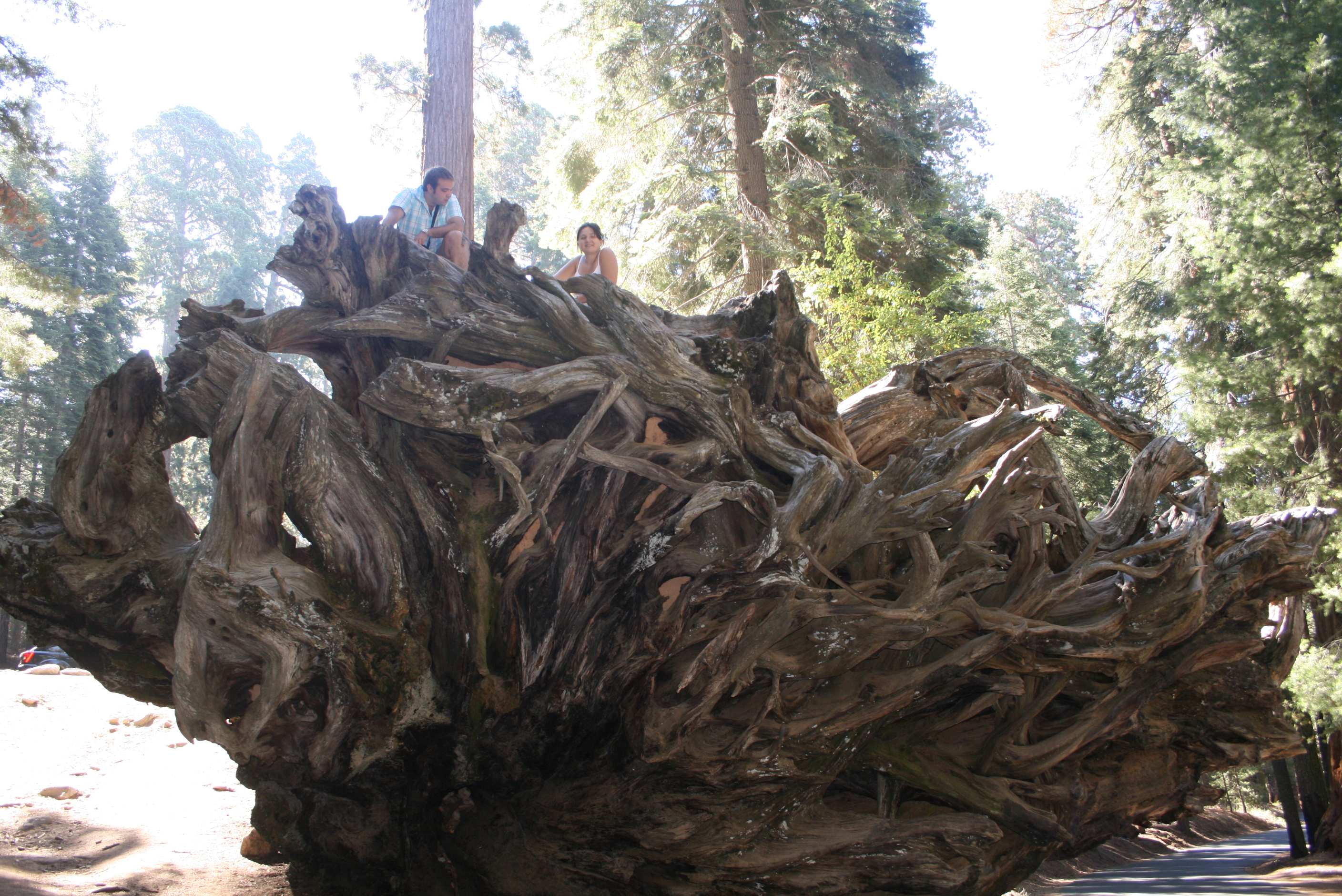 Quand ces géants tombent, on découvre ses énormes racines. Sur la photo ci-dessus nous sommes montés sur ces racines. On peux se rendre compte de leurs tailles par rapport à nous.