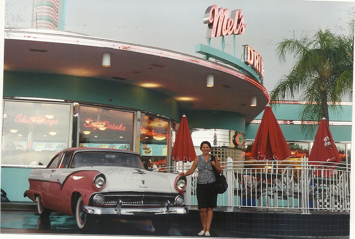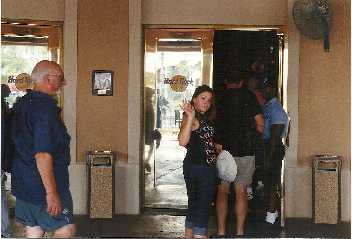 Nous avons mangĂ© au Hard Rock CafĂ©. Câest une chaĂźne de restaurants particuliĂšre car sa dĂ©co est vraiment trĂšs rock&roll. Dans celui du parc, une voiture est fixĂ©e en hauteur sur le bar arrondi et tourne sur place.