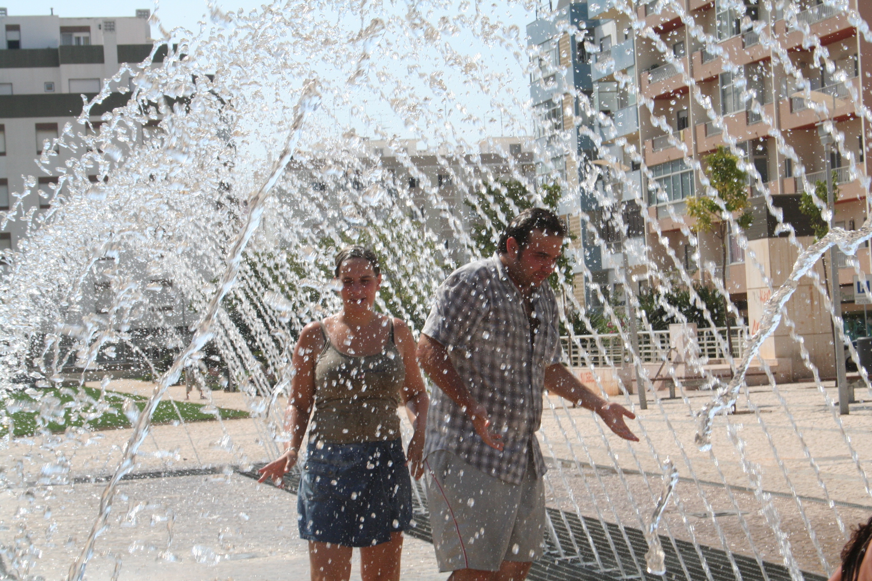 Ensuite, nous arrivons Place da Igreja do ColĂ©gio. Elle nous offre un cadeau trĂšs apprĂ©ciĂ© : des jets d’eau sont projetĂ©s depuis le sol et nous invitent Ă nous rafraichir. Nous avions tellement chaud qu’il est impossible d’y rĂ©sister.